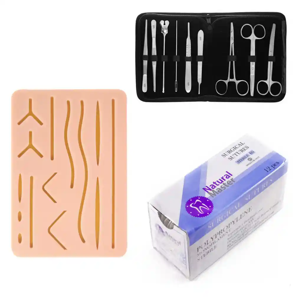 ESTE KIT CONTIENE: - 1 Kit de disección GMD Personalizado X 9 piezas - 1 Caja de suturas de 12 Unidades. - 1 Almohadilla de practica de sutura - Par de guantes El sistema o Kit de Disección de GMD contiene todos los elementos necesarios para llevar acabo disecciones. Todas sus piezas están fabricadas en acero inoxidable, suministrados en un práctico estuche con cremallera que mantiene sus piezas almacenadas perfectamente.
