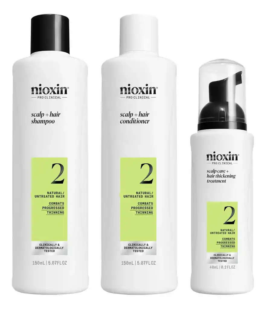 Kit 2 del sistema Nioxin, tratamiento para fortalecer y engrosar el cabello, para cabello natural con adelgazamiento progresivo, tamaño de prueba (suministro para 1 mes) : el sistema Nioxin 2 proporciona un cabello más grueso y abundante, a la vez que protege cada mechón de cabello contra el daño. Premio: Cuidado para adelgazar favorito del ganador del premio Stylist Choice de Behind the Chair, 16 años consecutivos: fortalece la resiliencia del cabello contra el daño y la rotura, a la vez que proporciona control y equilibrio de humedad al cabello - Tratamiento capilar profesional, sistema de nioxina 2 para cabello natural con adelgazamiento progresivo - El kit del sistema Nioxin 2 deja el cabello más grueso y con un brillo saludable - Ayuda a eliminar el sebo, los ácidos grasos y los residuos ambientales que obstruyen los folículos del cuero cabelludo y el cabello y la textura evita que se rompa y aumenta la plenitud de cada mechón capilar : siga el uso sugerido para obtener mejores resultados: Paso 1: masajear el cabello y el cuero cabelludo, enjuagar Paso 2: aplicar desde el cuero cabelludo hasta las puntas, enjuagar Paso 3: agitar, aplicar en el cuero cabelludo, no enjuagar; complementa cualquier kit de sistema capilar Nioxin con productos de cuidado intensivo Nioxin