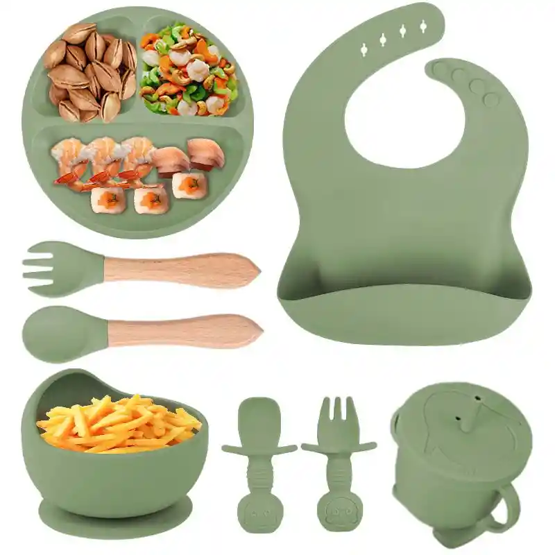 Kit de comida para bebés y niños sin BPA con 8 piezas de silicona variadas Este juego de 8 platos con ventosa para niños está hecho de silicona de alta calidad sin BPA, lo que garantiza la seguridad durante las comidas. El babero de silicona es suave y los demás utensilios, como cuencos, platos, tenedores y cucharas, son resistentes a las caídas. La textura antideslizante de la silicona anima a los bebés a comer de forma independiente, evitando salpicaduras y suciedad. Es perfecto para el uso diario, ya que resiste el desgaste y el uso constante. Compacto y ligero, es ideal para viajar, acampar, hacer picnics y cenas familiares. Su tamaño moderado se adapta a la mayoría de las mesas y sillas para niños, por lo que es fácil de transportar. Además, se puede usar en el microondas y el refrigerador, manteniendo los alimentos a la temperatura adecuada. Este juego completo de cubiertos es un regalo significativo para los padres primerizos. Especificaciones: Material: silicona apta para uso alimentario (sin BPA) Tamaños: plato (19 x 18,2 cm), babero (24 x 29,5 cm), cuenco (11,2 x 11 cm), cuchara (13,5 x 3,5 cm), taza de agua (14 x 14 cm) Rango de edad: más de 3 meses El paquete incluye: 1 plato de silicona 1 bol 1 cuchara con mango de madera 1 tenedor con mango de madera 1 babero 1 taza de agua 2 tapas para tazas