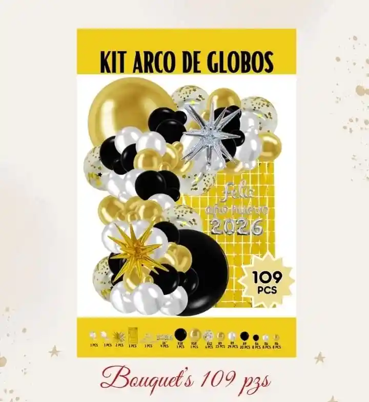 Crea un ambiente festivo y alegre con esta Decoración elegante de 109 piezas, ideal para resaltar tus celebraciones de fin de año. Incluye globos en tonos dorado, blanco y Negro, figuras inflables, y el hermoso letrero “Feliz Año Nuevo 2026”. Características: Material: Látex y foil de alta calidad Colores vivos y metálicos para una decoración elegante Fácil de armar y combinar con otros accesorios Perfecto para hogares, negocios o eventos Tener en cuenta: Los globos se envían desinflados.