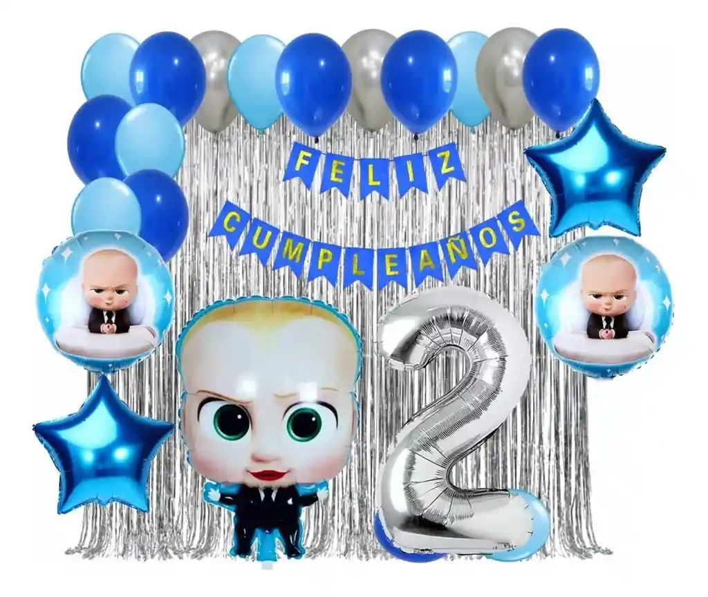 *********************GLOBOS Y PELUCHES MASMELO********************* Por tu compra te llevas. 2 Cortina plateado 1×2 metros 36 Globo surtido: azul celeste, azul rey, plateado satinado 30cm 2 Globo circular Jefe en pañales 45x45cm 1 Globo Jefe en pañales 60×45 cm 2 Globo azul rey estrella 45x45cm 1 Globo número plateado segun tu elección 82 cm de altura 1 guirnalda feston feliz cumpleaños 2 metros de largo 5 metros de nylon para amarrar globos *Los globos se entregan desinflados, tu compra no incluye el montaje ni la decoración, el servicio de armado no lo tenemos disponible. sin embargo te damos todas las instrucciones para hacer de modo profesional. Si deseas adicionar otros articulos a tu compra puedes escribirnos, recuerda que Somos Globos y Peluches Masmelo Si necesitas variación en los colores, colocar un número, más globos o realizar otros cambios en el diseño original escribenos para ver si podemos hacerlo. Tenemos todo lo necesario para tus decoraciones, somos lo último en tendencias mundiales decorativas. Tenemos disponible: Vasos, platos, manteles, guirnaldas, cubiertos, globos de todo tipo, números, letreros, vela, Etc. Puedes encontrar los articulos de nuestra tienda en el siguiente link, copia y pega, si no encuentas lo que necesitas escribenos: https://www.rappi.com.co/tiendas/900280040-globosypeluchesmasmelo-mt-enc/decoracion-para-fiestas/globos-y-bombas