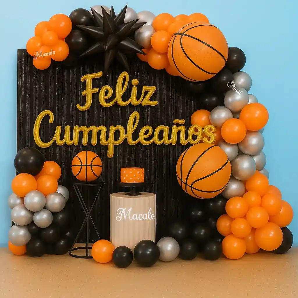 Kit Decoración Cumpleaños Baloncesto – 75 Piezas Globos y Fondo Temático DESCRIPCIÓN: Celebra a lo grande con este kit completo de decoración temática de baloncesto, Incluye un total de 75 piezas entre globos en tonos naranja, negro, plateado y dorado, además de elementos decorativos que crean un fondo espectacular con el letrero “Feliz Cumpleaños”. * Ideal para fiestas infantiles, juveniles o de adultos fanáticos del baloncesto. * Material resistente y de fácil instalación. * Perfecto para decorar salas, terrazas o salones de eventos. Con este kit tendrás todo lo necesario para montar un escenario profesional, divertido y fotogénico, listo para sorprender a tus invitados. El Kit incluye: •1 Cortina en color Negro de Flecos •3 Globos FELIZ CUMPLEAÑOS Dorado •2 Globos metalizados Balon de Baloncesto 18" Pulgadas, (45x45cm) •1 Estrella 12 Puntas Grande en color Negro •25 Globos en Látex de 5" (Plateado, Negro y Naranja) •40 Globos en Látex de 10" (Plateado, Negro y Naranja) •1 Globo Látex de 12" En color Naranja •1 Cinta •Stiker Circulares TENER EN CUENTA: •LOS GLOBOS VIENEN DESINFLADOS •"SOLO VIENE LO ESPECIFICADO EN LA DESCRIPCIÓN. IMAGENES ADICIONALES SON SOLO PARA AMBIENTACIÓN."