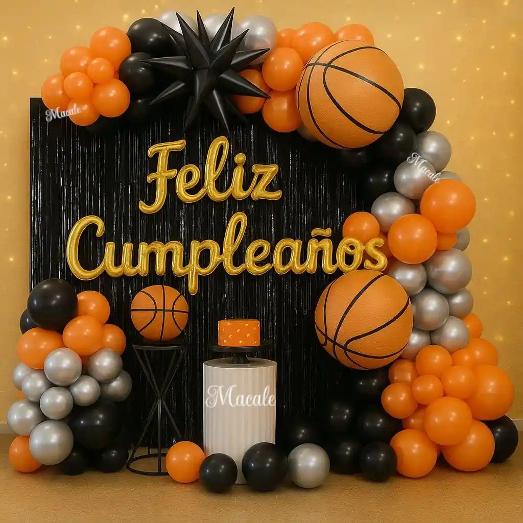 Kit Decoración Cumpleaños Baloncesto – 75 Piezas Globos y Fondo Temático DESCRIPCIÓN: Celebra a lo grande con este kit completo de decoración temática de baloncesto, Incluye un total de 75 piezas entre globos en tonos naranja, negro, plateado y dorado, además de elementos decorativos que crean un fondo espectacular con el letrero “Feliz Cumpleaños”. * Ideal para fiestas infantiles, juveniles o de adultos fanáticos del baloncesto. * Material resistente y de fácil instalación. * Perfecto para decorar salas, terrazas o salones de eventos. Con este kit tendrás todo lo necesario para montar un escenario profesional, divertido y fotogénico, listo para sorprender a tus invitados. El Kit incluye: •1 Cortina en color Negro de Flecos •3 Globos FELIZ CUMPLEAÑOS Dorado •2 Globos metalizados Balon de Baloncesto 18" Pulgadas, (45x45cm) •1 Estrella 12 Puntas Grande en color Negro •25 Globos en Látex de 5" (Plateado, Negro y Naranja) •40 Globos en Látex de 10" (Plateado, Negro y Naranja) •1 Globo Látex de 12" En color Naranja •1 Cinta •Stiker Circulares TENER EN CUENTA: •LOS GLOBOS VIENEN DESINFLADOS •"SOLO VIENE LO ESPECIFICADO EN LA DESCRIPCIÓN. IMAGENES ADICIONALES SON SOLO PARA AMBIENTACIÓN."