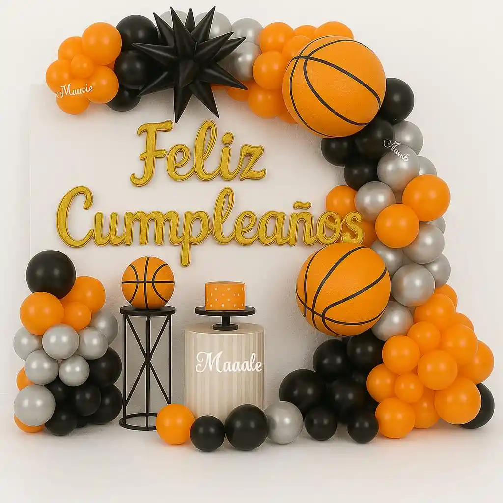 Kit Decoración Cumpleaños Baloncesto – 75 Piezas Globos y Fondo Temático DESCRIPCIÓN: Celebra a lo grande con este kit completo de decoración temática de baloncesto, Incluye un total de 75 piezas entre globos en tonos naranja, negro, plateado y dorado, además de elementos decorativos que crean un fondo espectacular con el letrero “Feliz Cumpleaños”. * Ideal para fiestas infantiles, juveniles o de adultos fanáticos del baloncesto. * Material resistente y de fácil instalación. * Perfecto para decorar salas, terrazas o salones de eventos. Con este kit tendrás todo lo necesario para montar un escenario profesional, divertido y fotogénico, listo para sorprender a tus invitados. El Kit incluye: •1 Cortina en color Negro de Flecos •3 Globos FELIZ CUMPLEAÑOS Dorado •2 Globos metalizados Balon de Baloncesto 18" Pulgadas, (45x45cm) •1 Estrella 12 Puntas Grande en color Negro •25 Globos en Látex de 5" (Plateado, Negro y Naranja) •40 Globos en Látex de 10" (Plateado, Negro y Naranja) •1 Globo Látex de 12" En color Naranja •1 Cinta •Stiker Circulares TENER EN CUENTA: •LOS GLOBOS VIENEN DESINFLADOS •"SOLO VIENE LO ESPECIFICADO EN LA DESCRIPCIÓN. IMAGENES ADICIONALES SON SOLO PARA AMBIENTACIÓN."