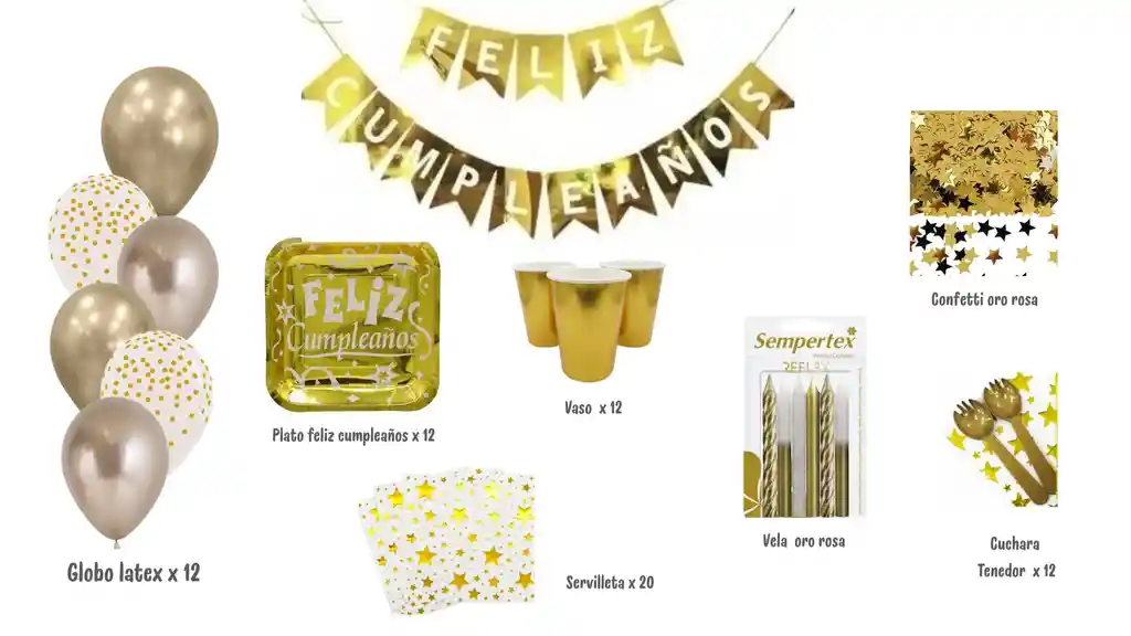 Kit para cumpleaños dorado y champaña: 1 feston feliz cumpleaños, 12 globos de latex, 1 paquete de vasos x 12, 1 paquete de platos x 12, servilletas x 20, velas x 5, confetti dorado y cuchara tenedor dorado
