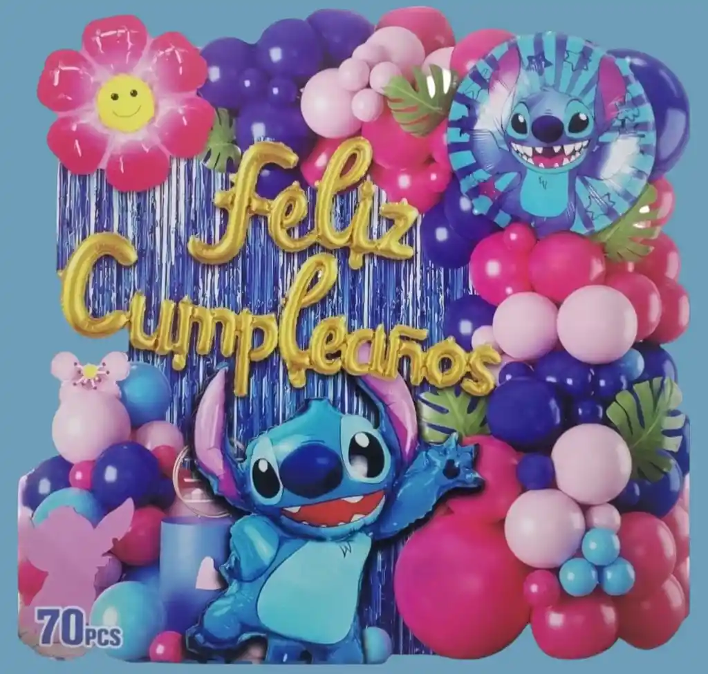 Celebra de manera única con esta hermosa decoración temática Feliz Cumpleaños de Stitch. Este set incluye 70 piezas, perfectas para crear un ambiente festivo y colorido en el cumpleaños de tus pequeños. Viene con globos de diferentes colores, un adorable globo con la imagen de Stitch, y detalles divertidos como flores y hojas tropicales. Ideal para hacer de tu fiesta un momento inolvidable. ¡Haz que su día sea tan especial como su personaje favorito! Tener en Cuenta: El kit de globos vienen desinflados.
