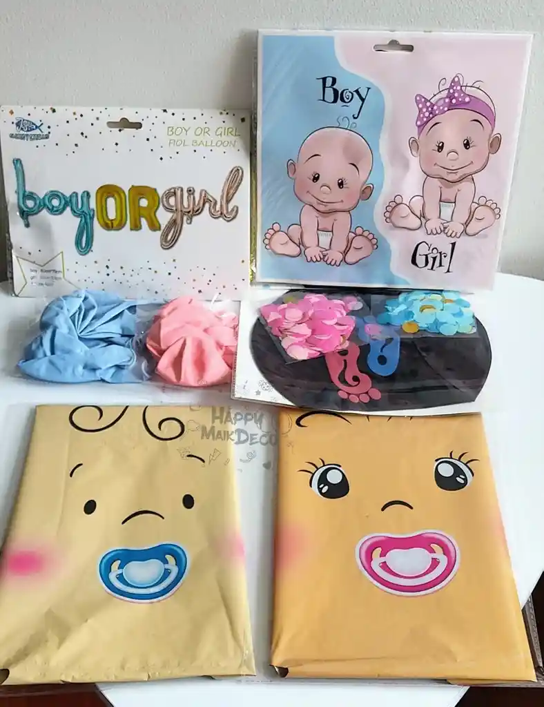 *********************GLOBOS Y PELUCHES MASMELO********************* Por tu compra te llevas: 1 Globo grande revelación de sexo, con confetti azul y rosado de 36" 90cms aprox. 1 letrero en Globos metálizados " girl or boy" 9 Globos R12 azules pastel. 9 Globos R12 rosados 2 bebés niño y niña de 69 X 45cms Los globos se entregan desinflados. Puedes encontrar los articulos de nuestra tienda en el siguiente link, copia y pega, si no encuentas lo que necesitas escribenos: https://www.rappi.com.co/tiendas/900280040-globosypeluchesmasmelo-mt-enc/decoracion-para-fiestas/globos-y-bombas