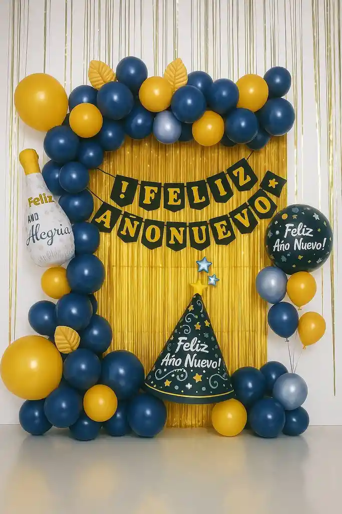 Kit Decoración Feliz Año Nuevo 76 Piezas Globos Dorado Azul Plateado Celebra la llegada del nuevo año con estilo con este Kit de Decoración “Feliz Año Nuevo” de 76 piezas, diseñado para crear un ambiente elegante y festivo en cualquier espacio. Ideal para fiestas en casa, locales, oficinas o eventos especiales. Contenido del kit (76 piezas): •Globos en tonos dorado, azul oscuro y plateado •Guirnalda con letrero “¡Feliz Año Nuevo!” •Globo metálico con diseño de botella de champaña •Globo grande redondo “Feliz Año Nuevo” •Sombrero decorativo grande •Hojas decorativas doradas •Cortina metálica dorada de fondo Características: •Colores brillantes y elegantes •Ideal para fotos, decoraciones de pared o entrada •Fácil de armar y decorar •Material resistente y de alta calidad Tener en Cuenta: •Los globos se envían desinflados. •Solo incluye lo descrito en la publicación; los accesorios adicionales son decorativos para la foto.
