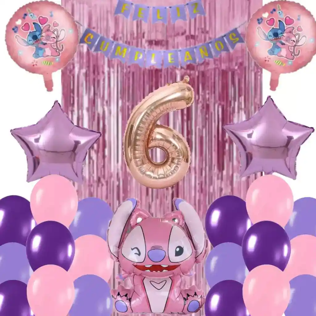 *********************GLOBOS Y PELUCHES MASMELO********************* Somos Mercado Líder Platinum Por tu compra te llevas: 1 Globo número oro rosa 82 cm de altura 2 Globo estrella mora leche 45x45cm 6 Globo morado 30cm 6 Globo morado pastel 30cm 6 Globo pastel rosado 30cm 2 Globo circular 45x45cm temática Stitch 1 Festón plateado 2 metros de largo 1 Cortina oro rosa 2x1 metros 1 Globo Ángel 65x45cm
