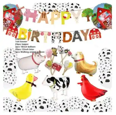 Kit de Decoración para Cumpleaños Temática Granja El paquete incluye: 1 banner (happy birthday) 24 pinchos con temática de la granja 2 globos de 18" estampado granja 20 globos de 12" 5 globos animales cuerpo entero (pato, gallina, vaca, cerdo)