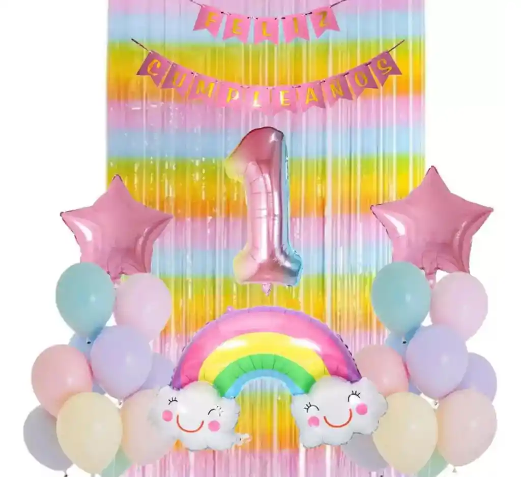 *********************GLOBOS Y PELUCHES MASMELO********************* Somos Mercado Líder Platinum Por tu compra te llevas: 1 Globo arcoíris 80x45cm 1 Globo festón oro rosa 2 metros de largo 1 Globo número 82 cm de altura según tu elección 2 Globo estrella rosada 45x45cm 6 Globo azul pastel 30cm 6 Globo amarillo pastel 30cm 6 Globo rosado 30cm 6 Globo morado pastel 30cm 6 Globo verde pastel 30cm 1 Cortina arcoíris 2x1 metros