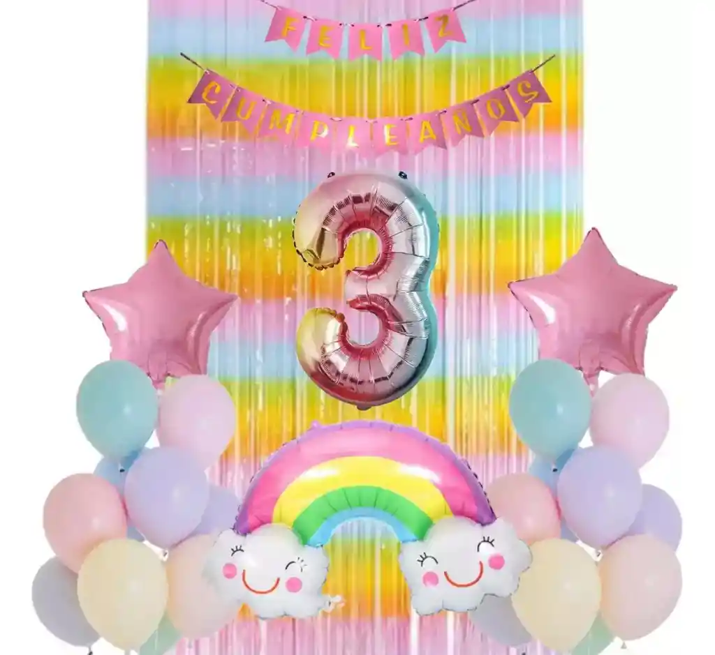 *********************GLOBOS Y PELUCHES MASMELO********************* Somos Mercado Líder Platinum Por tu compra te llevas: 1 Globo arcoíris 80x45cm 1 Globo festón oro rosa 2 metros de largo 1 Globo número 82 cm de altura según tu elección 2 Globo estrella rosada 45x45cm 6 Globo azul pastel 30cm 6 Globo amarillo pastel 30cm 6 Globo rosado 30cm 6 Globo morado pastel 30cm 6 Globo verde pastel 30cm 1 Cortina arcoíris 2x1 metros