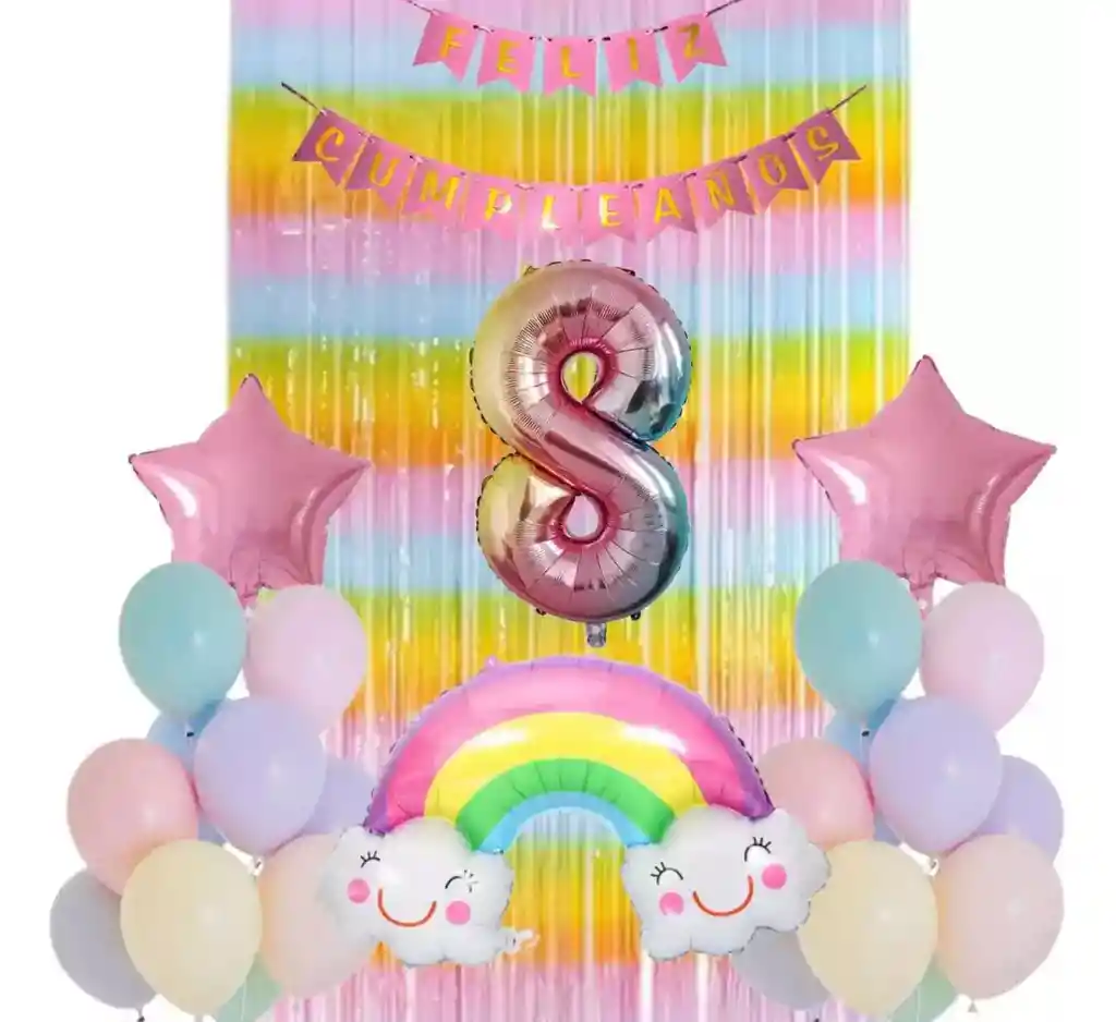 *********************GLOBOS Y PELUCHES MASMELO********************* Somos Mercado Líder Platinum Por tu compra te llevas: 1 Globo arcoíris 80x45cm 1 Globo festón oro rosa 2 metros de largo 1 Globo número 82 cm de altura según tu elección 2 Globo estrella rosada 45x45cm 6 Globo azul pastel 30cm 6 Globo amarillo pastel 30cm 6 Globo rosado 30cm 6 Globo morado pastel 30cm 6 Globo verde pastel 30cm 1 Cortina arcoíris 2x1 metros
