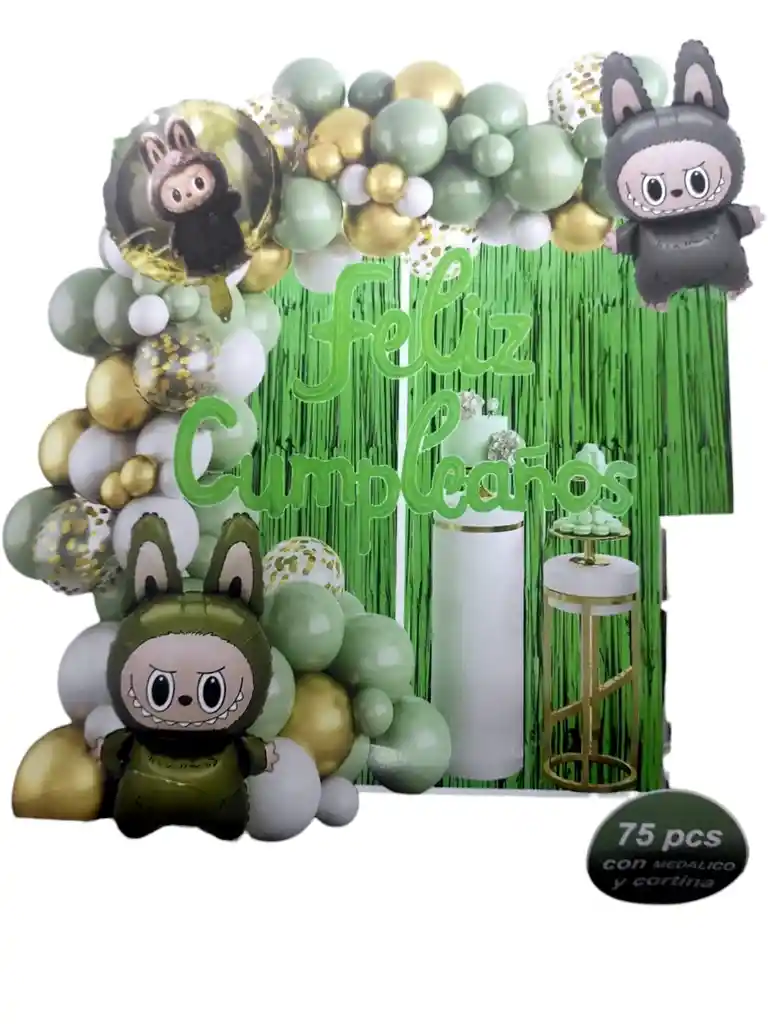 decoracion para fiesta tematica de labubu incluye 75 piezas entre ellas 3 globos metalizados del personaje 1 globo metalizado de feliz cumpleaños color verde 1 cortina largo de 2 metros por 1 metro color verde 1 rollo de puntos de pegamento 1 cinta de arco 1 pitillo para inflar los globos metalizados lo demas son globos de latex combinados en colores dorado, blanco y verde los globos se envian sin inflar si deseas algo adicional indicanos y con gusto te colaboramos