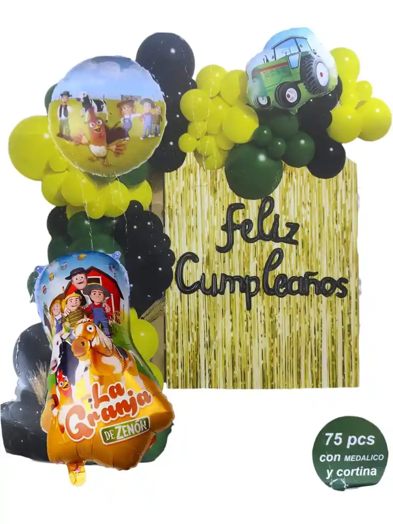 decoracion para fiesta tematica de la granja de zenon incluye 75 piezas entre ellas 3 globos metalizados del personaje 1 globo metalizado de feliz cumpleaños color negro 1 cortina largo de 2 metros por 1 metro color dorado 1 rollo de puntos de pegamento 1 cinta de arco 1 pitillo para inflar los globos metalizados lo demas son globos de latex combinados en colores amarillo, negro y verde los globos se envian sin inflar si deseas algo adicional indicanos y con gusto te colaboramos