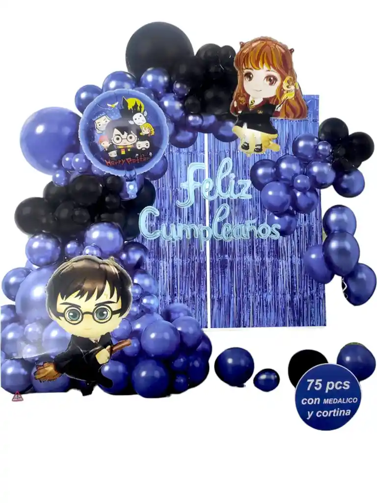 decoracion para fiesta tematica de harry potter incluye 75 piezas entre ellas 3 globos metalizados del personaje 1 globo metalizado de feliz cumpleaños color azul claro 1 cortina largo de 2 metros por 1 metro color azul 1 rollo de puntos de pegamento 1 cinta de arco 1 pitillo para inflar los globos metalizados lo demas son globos de latex combinados en colores negro y azul oscuro los globos se envian sin inflar si deseas algo adicional indicanos y con gusto te colaboramos