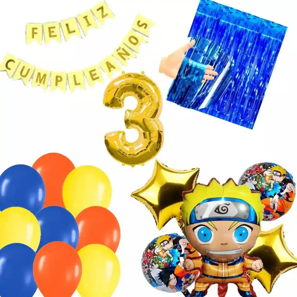 *********************GLOBOS Y PELUCHES MASMELO********************* Por tu compra te llevas. 1 Cortina flecos azul 1×2 metros 1 Feston feliz cumpleaños 2 metros de largo 1 Globo número dorado 82 cm 2 Globo dorado estrella 45x45cm 2 Globo circular temática Naruto 45x45cm 1 Globo Naruto 65x45cm 4 Globo naranja 30cm 4 Globo amarillo 30cm 4 Globo azul rey 30 cm *Los globos se entregan desinflados, tu compra no incluye el montaje ni la decoración, el servicio de armado no lo tenemos disponible. sin embargo te damos todas las instrucciones para hacer de modo profesional. Si deseas adicionar otros articulos a tu compra puedes escribirnos, recuerda que Somos Globos y Peluches Masmelo Si necesitas variación en los colores, colocar un número, más globos o realizar otros cambios en el diseño original escribenos para ver si podemos hacerlo. Tenemos todo lo necesario para tus decoraciones, somos lo último en tendencias mundiales decorativas. Tenemos disponible: Vasos, platos, manteles, guirnaldas, cubiertos, globos de todo tipo, números, letreros, vela, Etc. Puedes encontrar los articulos de nuestra tienda en el siguiente link, copia y pega, si no encuentas lo que necesitas escribenos: https://www.rappi.com.co/tiendas/900280040-globosypeluchesmasmelo-mt-enc/decoracion-para-fiestas/globos-y-bombas