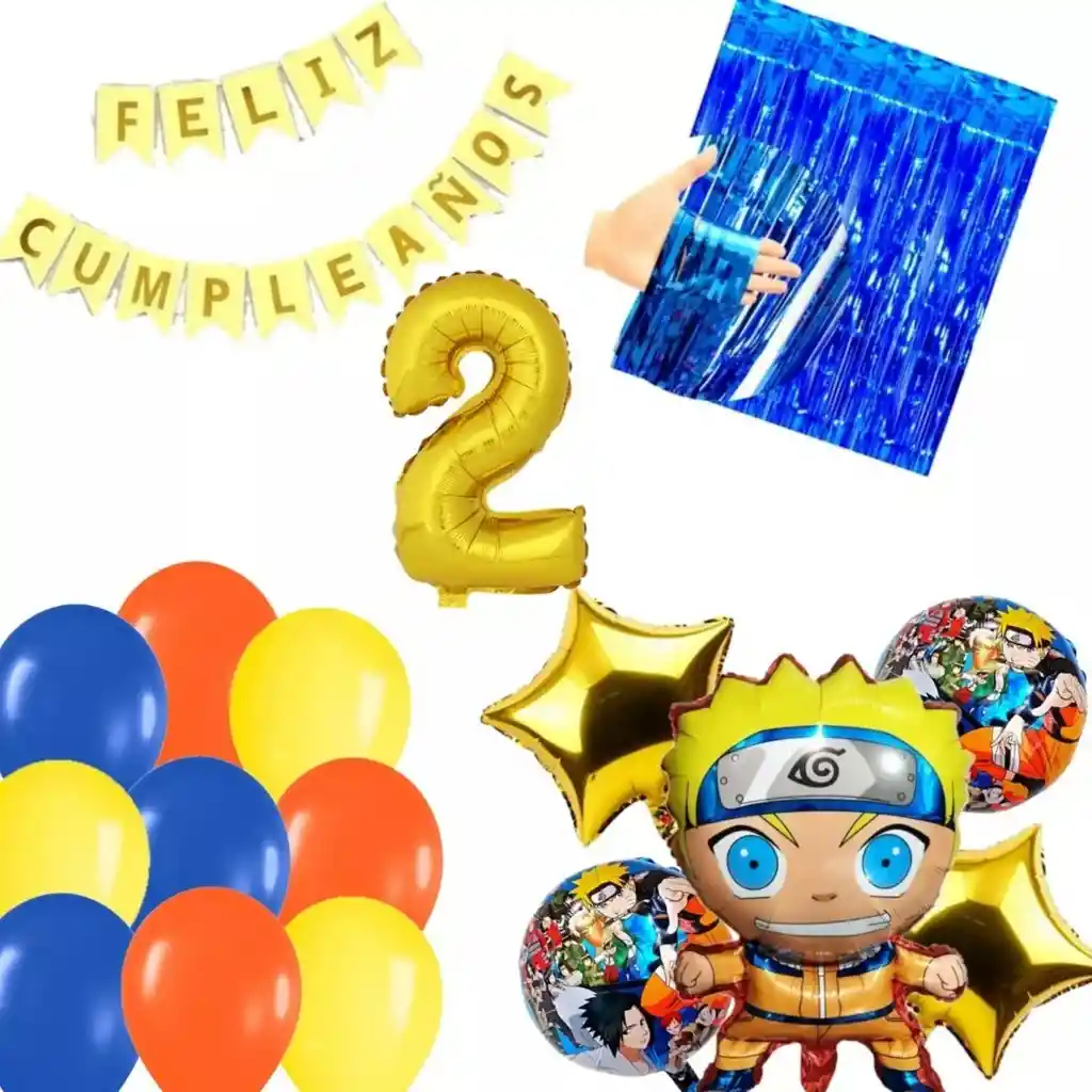 *********************GLOBOS Y PELUCHES MASMELO********************* Por tu compra te llevas. 1 Cortina flecos azul 1×2 metros 1 Feston feliz cumpleaños 2 metros de largo 1 Globo número dorado 82 cm 2 Globo dorado estrella 45x45cm 2 Globo circular temática Naruto 45x45cm 1 Globo Naruto 65x45cm 4 Globo naranja 30cm 4 Globo amarillo 30cm 4 Globo azul rey 30 cm *Los globos se entregan desinflados, tu compra no incluye el montaje ni la decoración, el servicio de armado no lo tenemos disponible. sin embargo te damos todas las instrucciones para hacer de modo profesional. Si deseas adicionar otros articulos a tu compra puedes escribirnos, recuerda que Somos Globos y Peluches Masmelo Si necesitas variación en los colores, colocar un número, más globos o realizar otros cambios en el diseño original escribenos para ver si podemos hacerlo. Tenemos todo lo necesario para tus decoraciones, somos lo último en tendencias mundiales decorativas. Tenemos disponible: Vasos, platos, manteles, guirnaldas, cubiertos, globos de todo tipo, números, letreros, vela, Etc. Puedes encontrar los articulos de nuestra tienda en el siguiente link, copia y pega, si no encuentas lo que necesitas escribenos: https://www.rappi.com.co/tiendas/900280040-globosypeluchesmasmelo-mt-enc/decoracion-para-fiestas/globos-y-bombas