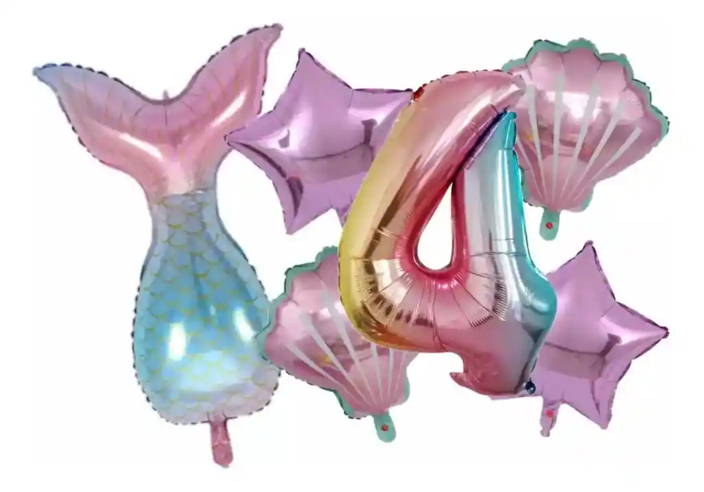 *********************GLOBOS Y PELUCHES MASMELO********************* Somos Mercado Líder Platinum Por tu compra te llevas: 1 Cola de sirena 65x45cm 2 Globo mora leche 45x45cm 2 Globo concha de mar 45x45cm 1 Globo número tornasol número según tu elección 82 cm altura