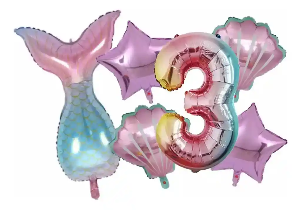 *********************GLOBOS Y PELUCHES MASMELO********************* Somos Mercado Líder Platinum Por tu compra te llevas: 1 Cola de sirena 65x45cm 2 Globo mora leche 45x45cm 2 Globo concha de mar 45x45cm 1 Globo número tornasol número según tu elección 82 cm altura