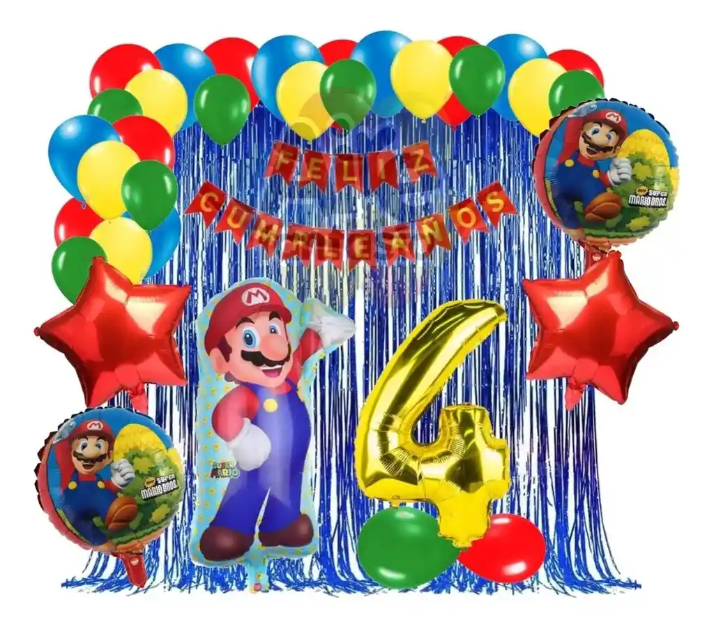*********************GLOBOS Y PELUCHES MASMELO********************* Por tu compra te llevas. 2 Cortina azul 1×2 metros 1 guirnalda feston feliz cumpleaños 2 metros de largo 36 Globo surtido: verde, azul, amarillo, rojo mate 30cm 2 Globo circular temática de Mario 2 Globo estrella rojo 45x45cm 1 Globo mario 60x50cm 1 Globo número dorado segun tu elección 82 cm de altura 5 metros de nylon para amarrar globos + 1 bengala de cumpleaños *Los globos se entregan desinflados, tu compra no incluye el montaje ni la decoración, el servicio de armado no lo tenemos disponible. sin embargo te damos todas las instrucciones para hacer de modo profesional. Si deseas adicionar otros articulos a tu compra puedes escribirnos, recuerda que Somos Globos y Peluches Masmelo Si necesitas variación en los colores, colocar un número, más globos o realizar otros cambios en el diseño original escribenos para ver si podemos hacerlo. Tenemos todo lo necesario para tus decoraciones, somos lo último en tendencias mundiales decorativas. Tenemos disponible: Vasos, platos, manteles, guirnaldas, cubiertos, globos de todo tipo, números, letreros, vela, Etc. Puedes encontrar los articulos de nuestra tienda en el siguiente link, copia y pega, si no encuentas lo que necesitas escribenos: https://www.rappi.com.co/tiendas/900280040-globosypeluchesmasmelo-mt-enc/decoracion-para-fiestas/globos-y-bombas