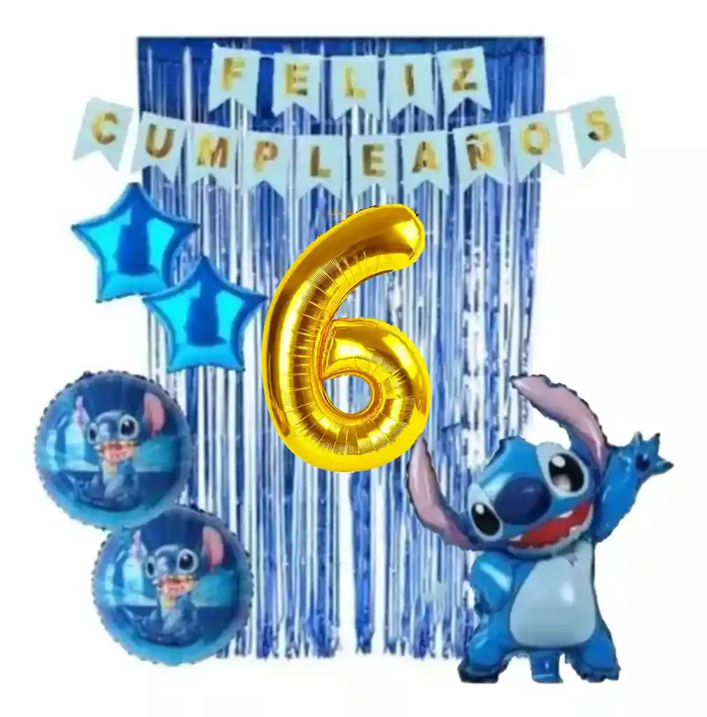 *********************GLOBOS Y PELUCHES MASMELO********************* Por tu compra te llevas. 1 Cortina flecos azul 1×2 metros 1 Feston feliz cumpleaños azul 2 Globo estrella 45x45cm 2 Globo circular temática Stitch 45x45cm 1 Globo Stitch 65x45cm *Los globos se entregan desinflados, tu compra no incluye el montaje ni la decoración, el servicio de armado no lo tenemos disponible. sin embargo te damos todas las instrucciones para hacer de modo profesional. Si deseas adicionar otros articulos a tu compra puedes escribirnos, recuerda que Somos Globos y Peluches Masmelo Si necesitas variación en los colores, colocar un número, más globos o realizar otros cambios en el diseño original escribenos para ver si podemos hacerlo. Tenemos todo lo necesario para tus decoraciones, somos lo último en tendencias mundiales decorativas. Tenemos disponible: Vasos, platos, manteles, guirnaldas, cubiertos, globos de todo tipo, números, letreros, vela, Etc. Puedes encontrar los articulos de nuestra tienda en el siguiente link, copia y pega, si no encuentas lo que necesitas escribenos: https://www.rappi.com.co/tiendas/900280040-globosypeluchesmasmelo-mt-enc/decoracion-para-fiestas/globos-y-bombas