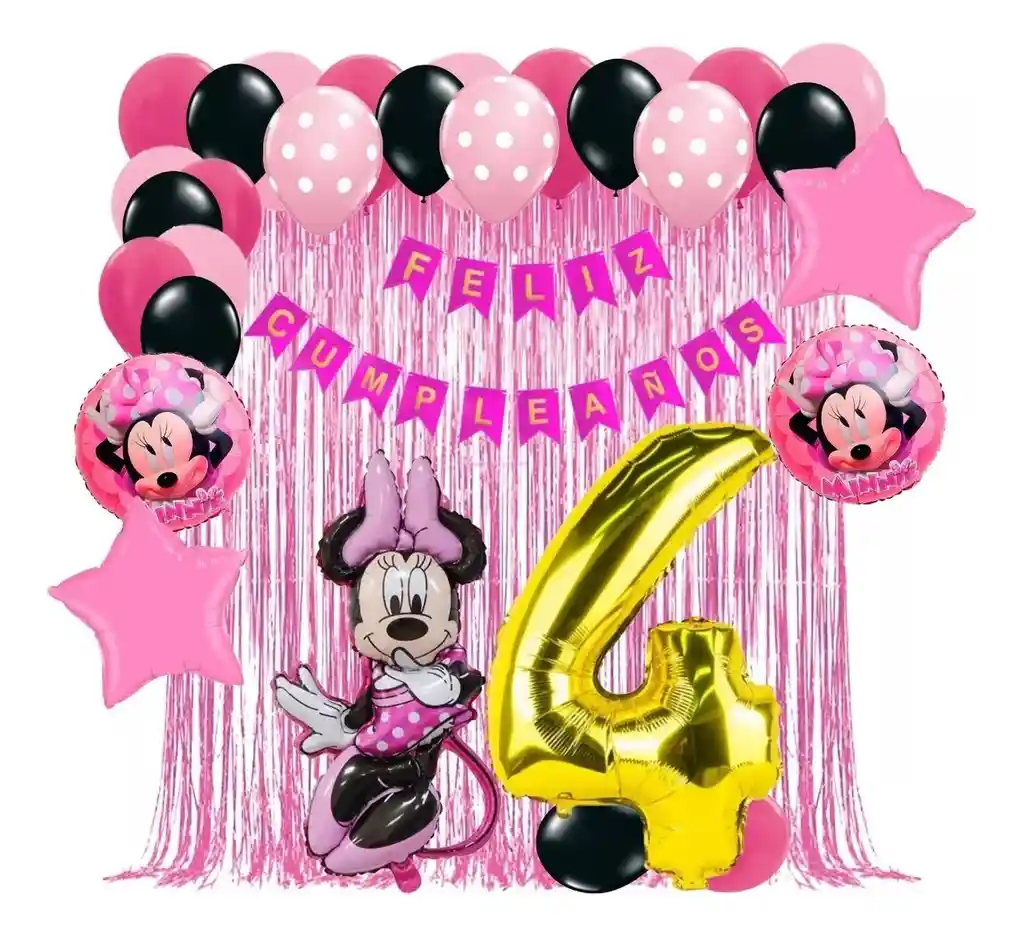 *********************GLOBOS Y PELUCHES MASMELO********************* Por tu compra te llevas. 2 Cortina oro rosa 1×2 metros 1 guirnalda feston feliz cumpleaños 2 metros de largo 36 Globo surtido: Negro, fucsia, rosado polka, rosad 30cm 2 Globo circular temática de minnie 2 Globo estrella rosada 45x45cm 1 Globo Minnie 60x50cm 1 Globo número dorado segun tu elección 82 cm de altura 5 metros de nylon para amarrar globos *Los globos se entregan desinflados, tu compra no incluye el montaje ni la decoración, el servicio de armado no lo tenemos disponible. sin embargo te damos todas las instrucciones para hacer de modo profesional. Si deseas adicionar otros articulos a tu compra puedes escribirnos, recuerda que Somos Globos y Peluches Masmelo Si necesitas variación en los colores, colocar un número, más globos o realizar otros cambios en el diseño original escribenos para ver si podemos hacerlo. Tenemos todo lo necesario para tus decoraciones, somos lo último en tendencias mundiales decorativas. Tenemos disponible: Vasos, platos, manteles, guirnaldas, cubiertos, globos de todo tipo, números, letreros, vela, Etc. Puedes encontrar los articulos de nuestra tienda en el siguiente link, copia y pega, si no encuentas lo que necesitas escribenos: https://www.rappi.com.co/tiendas/900280040-globosypeluchesmasmelo-mt-enc/decoracion-para-fiestas/globos-y-bombas