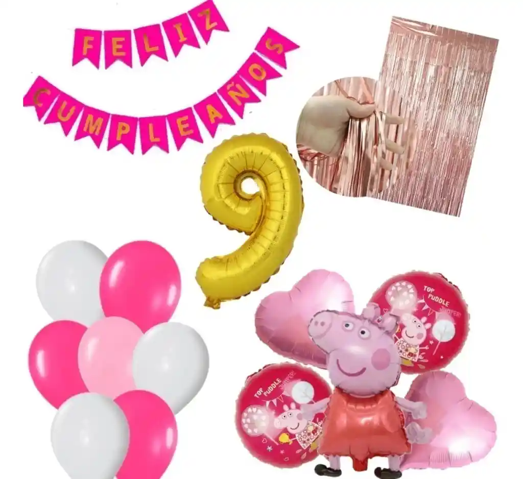 *********************GLOBOS Y PELUCHES MASMELO********************* Somos Mercado Líder Platinum Por tu compra te llevas: 1 Festón fucsia 2 metros 1 Cortina oro rosa 2x1 metros 3 Globo fucsia 30cm 4 Globo blanco 30cm 3 Globo rosado pastel 30cm 2 Globo corazón rosado 45x45cm 2 Globo circular temática Peppa Pig 45x45cm 1 Globo Peppa Pig 65x45cm 1 Globo número dorado 82 cm