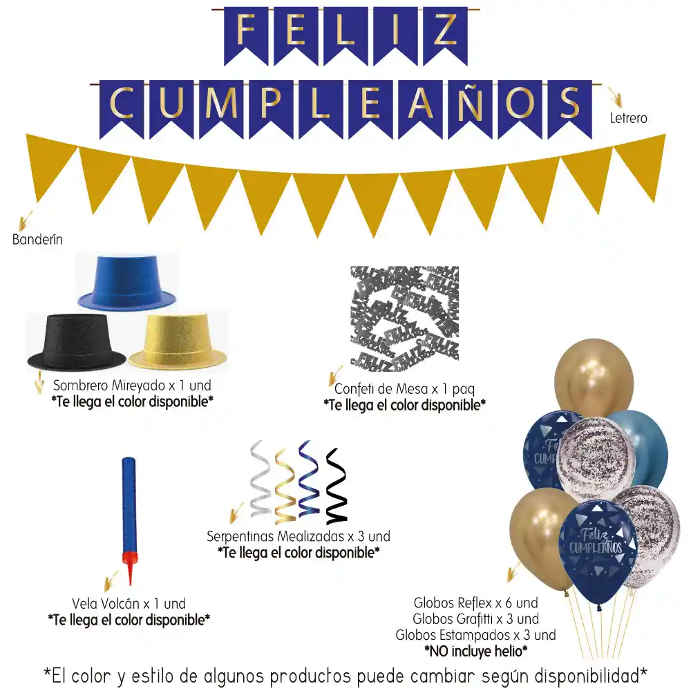 COTIZACIÓN: 1723 El color de algunos artículos pueden cambiar según disponibilidad Contiene: Letrero de cumpleaños Banderín Sombrero x 1 und (El color puede cambiar) Centro de mesa x 1 und (El color puede cambiar) Vela volcán x 1 und Serpentinas metalizadas x 36 und (El color puede cambiar) Globo réflex x 6 und (No incluye helio) Globo grafitti x 3 und (No incluye helio) Globo estampado x 6 und (Metal Ink. NO incluye helio)