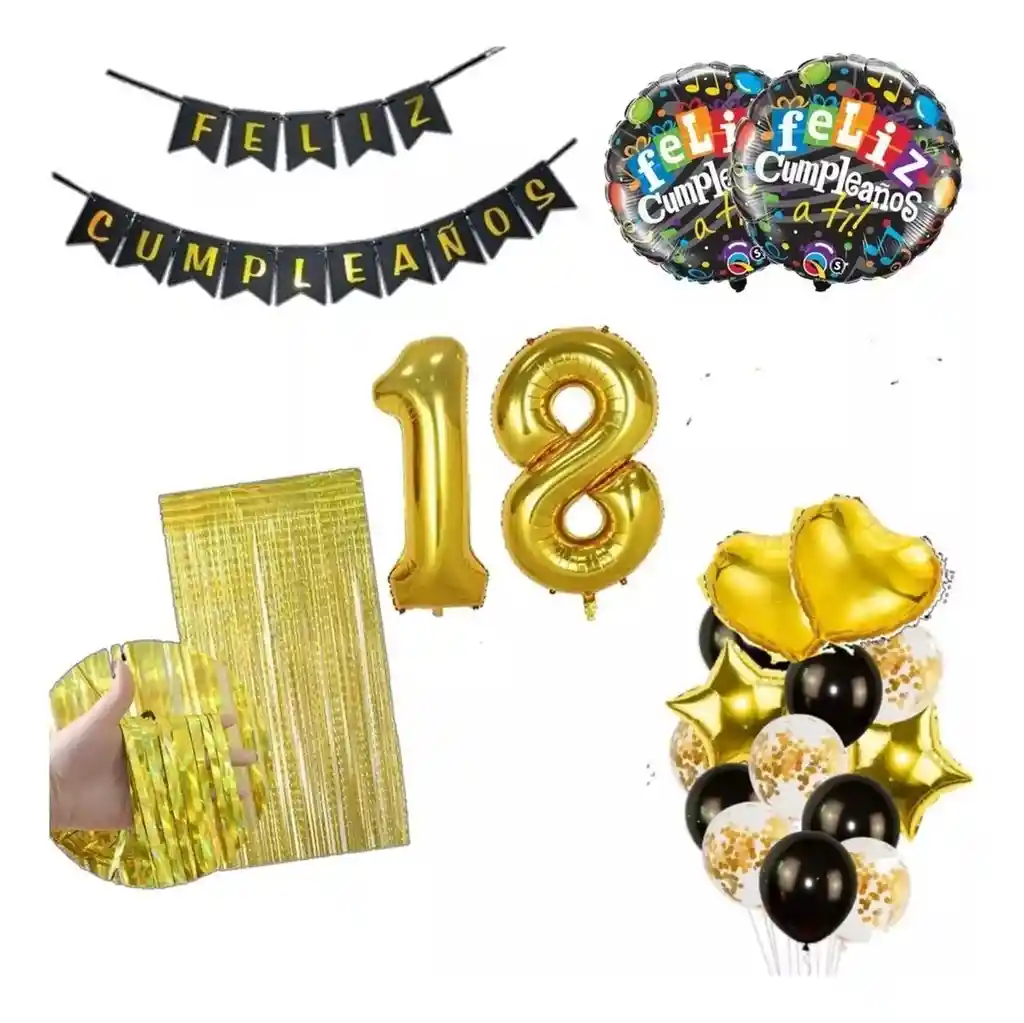 *********************GLOBOS Y PELUCHES MASMELO********************* Por tu compra te llevas. 1 Feston feliz cumpleaños negro 2 metros de largo 2 Globo número dorado 82 cmde altura 1 cortina flecos metalizada 2×1 metros 2 Globo circular 45×45 feliz cumpleaños negro (puede variar segun disponibilidad) 2 Globo corazón dorado 45x45cm 2 Globo estrella dorado 45x45cm 6 Globo transparente con confeti dorado 30 cm 7 Globo negro 30 cm *Los globos se entregan desinflados, tu compra no incluye el montaje ni la decoración, el servicio de armado no lo tenemos disponible. sin embargo te damos todas las instrucciones para hacer de modo profesional. Si deseas adicionar otros articulos a tu compra puedes escribirnos, recuerda que Somos Globos y Peluches Masmelo Si necesitas variación en los colores, colocar un número, más globos o realizar otros cambios en el diseño original escribenos para ver si podemos hacerlo. Tenemos todo lo necesario para tus decoraciones, somos lo último en tendencias mundiales decorativas. Tenemos disponible: Vasos, platos, manteles, guirnaldas, cubiertos, globos de todo tipo, números, letreros, vela, Etc. Puedes encontrar los articulos de nuestra tienda en el siguiente link, copia y pega, si no encuentas lo que necesitas escribenos: https://www.rappi.com.co/tiendas/900280040-globosypeluchesmasmelo-mt-enc/decoracion-para-fiestas/globos-y-bombas
