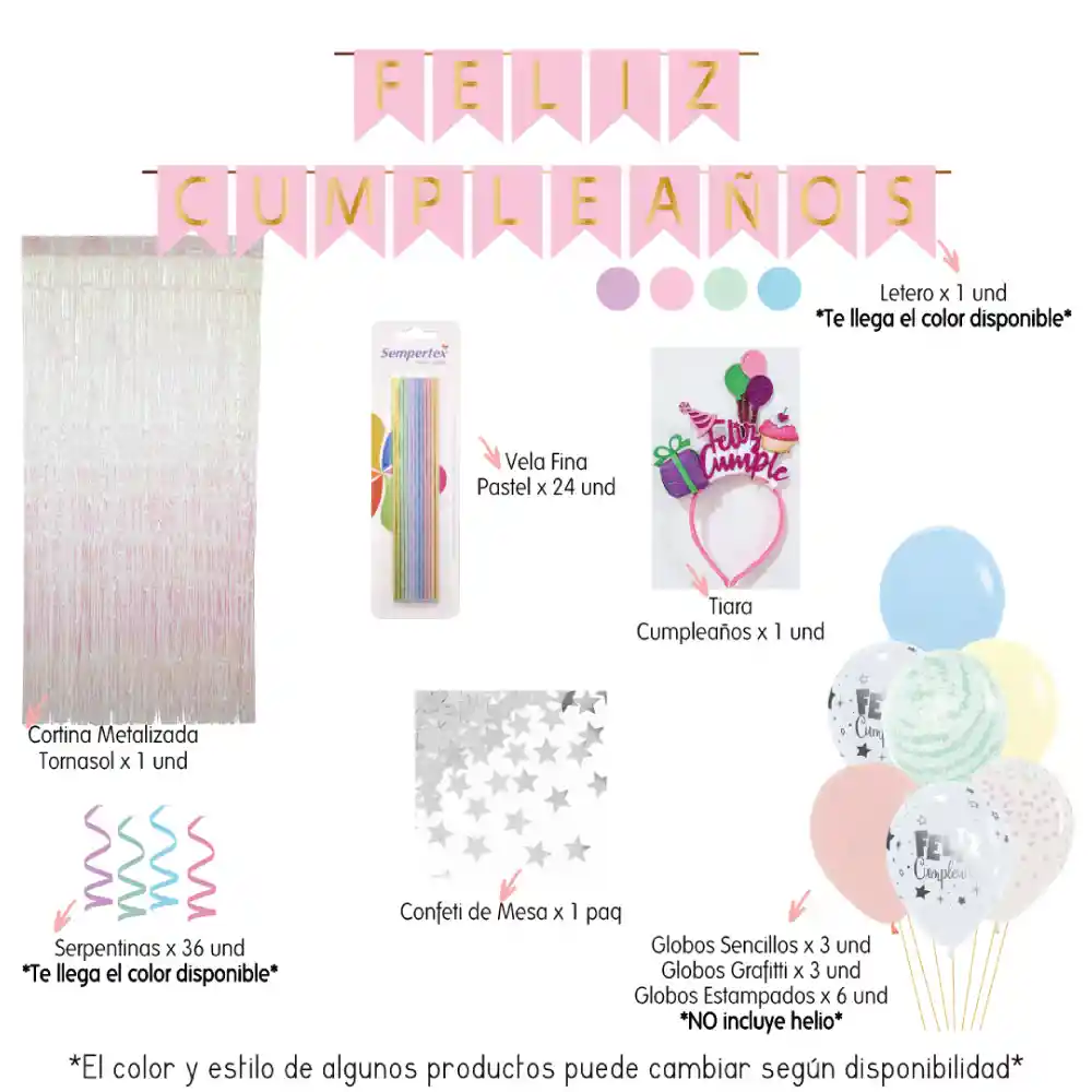 COTIZACIÓN: 1722 *El color de algunos artículos puede cambiar según disponibilidad* Contiene: letrero cumpleaños (El color puede cambiar) Cortina tornasol x 1 und Vela fina pastel x 24 und Confeti de mesa x 1 paquete Tiara cumpleaños x 1 und Serpentinas x 3 und (El color puede cambiar) Globos sencillos x 3 und (NO incluye helio) Globos grafitti x 3 und (NO incluye helio) Globos estampado x 6 und (NO incluye helio)