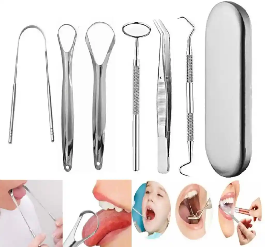 Higiene bucal: es un cuidado preventivo que puede detener tus problemas de salud bucal como mal aliento, caries dental, enfermedades de las encías, sensibilidad de los dientes, etc. El cepillo de dientes solo puede limpiar la superficie visible de tus dientes. Simplemente cepillarse los dientes no es suficiente. Pero nuestro kit de herramientas de higiene dental puede ayudarte eficazmente a abordar tus problemas de cuidado de la salud bucal de manera eficaz sin molesto costo de visita al dentista. Especificaciones Material: acero inoxidable Tipo: Herramientas dentales 6 accesorios Tu compra incluye Kit dental limpieza oral en acero set de 6 accesorios