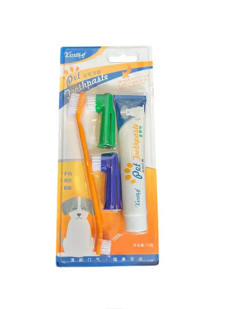 Kit dental para perros. Incluye crema dental, cepillo de dientes y dos dedales.