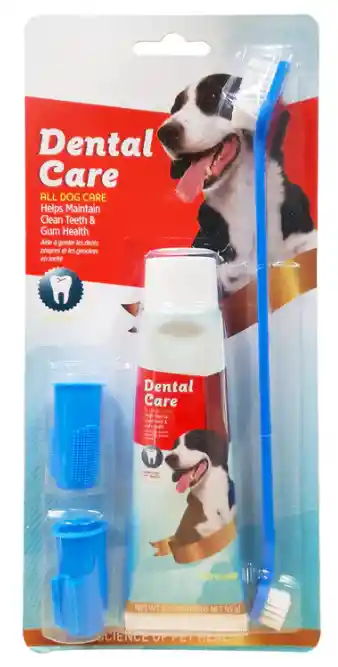 Kit dental con 2 dedales, cepillo dual ended y pasta con sabor a carne. La pasta contiene 95 grs. ideal para evitar el mal aliento y cuidar en todo momento a nuestro peludito del zarro y la placa que pueda afectar su salud dental.