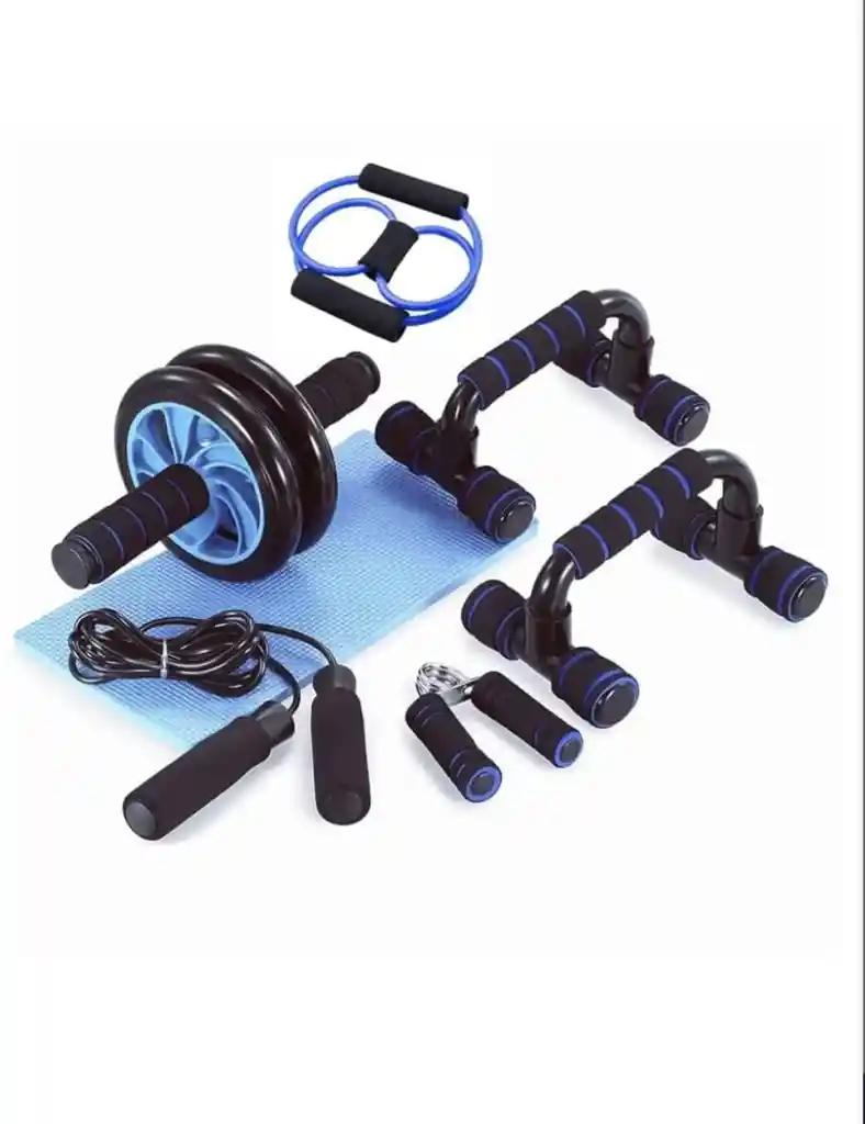 Kit deportivo Incluye Soportes para flexiones de pecho Una rueda abdominal Un lazo para salto Un pinza tensora o hand grip Una banda elastica
