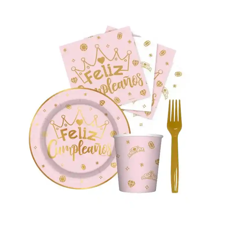 Juego de plato, vaso, servilletas y cubiertos. Ideal para celebrar ocasiones especiales. El kit contiene - 8 platos de cartón - 8 vasos de cartón - 16 servilletas - 12 tenedores Cada uno con su respectivo estampado