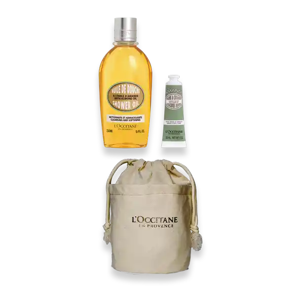 Kit Contiene 3 Unidades. Aceite de Ducha Almendras 250 mL + Crema Para Manos Almendras 30 mL + Bolsita Beige ...Ver más