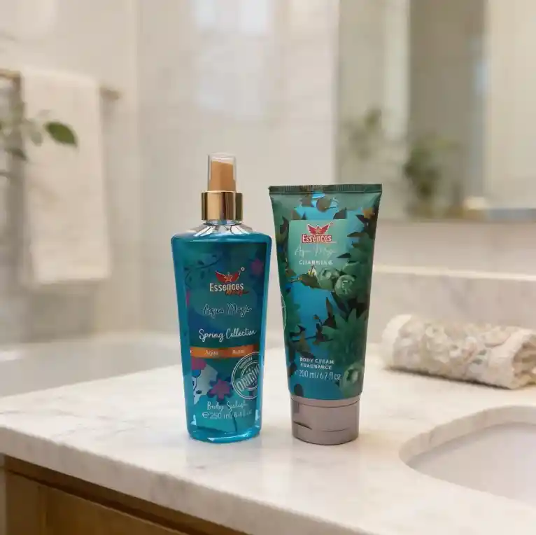 KIT DUO MAGIC KISS ROSAS Y FLORES Incluye caja Contiene: - Crema 200ml - Splash 250ml Aqua Kiss VS es una loción corporal con una fragancia fresca con notas de Fresia y margaritas. Está formulada para que la puedas mezclar y jugar con ella para así custodiarla y hacerla tuya sin reglas.