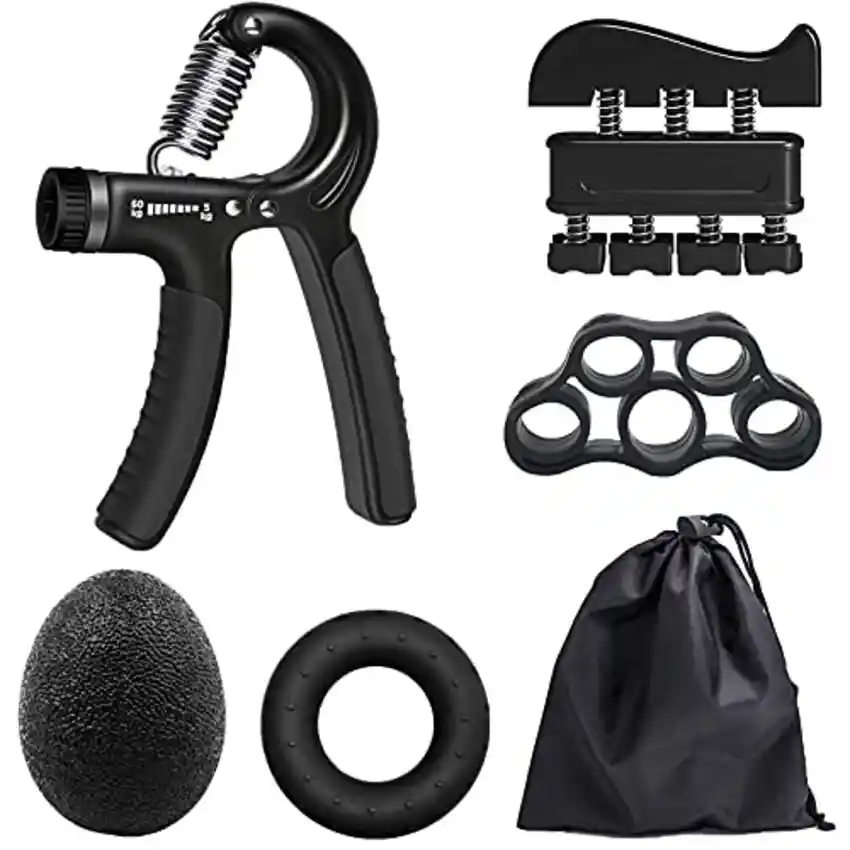 Ideal para todos: El agarre del antebrazo con empuñadura es ideal para mejorar la fuerza, la potencia y la velocidad en las muñecas, los dedos y los antebrazos. La mejor opción para los escaladores de roca, jugadores de tenis, atletas y músicos para mejorar la flexibilidad de los dedos y las muñecas. de lesiones: los ejercicios diarios de la mano con este ejercitador manual ayudan a recuperar lesiones en la mano, artritis reumatoide, artritis, túnel carpiano, tendovaginitis, fracturas, fracturas de muñeca y cirugía de tendones. Cómodo y duradero: El agarre ergonómico y suave del refuerzo de las empuñaduras es cómodo de sostener. Ajuste para manos pequeñas y grandes, personas mayores y adolescentes. La resistencia de las empuñaduras se puede ajustar fácilmente de 22 a 132 libras, perfecta para hombres y mujeres con diferentes fuerzas. Puedes usarlo en cualquier lugar y en cualquier momento, ¡muy fácil de usar! 1.Fortalecedor de Agarre de Mano Ajustable, 2.Ejercitador de Dedos, 3.Banda de Resistencia con estirador de Dedos, 4.Anillo de Agarre de Fortalecedor de Manos, 5.Bola de Agarre para Aliviar el Estrés Para ayudar a fortalecer y ejercitar la mano, dedos, muñecas, codos y antebrazos.