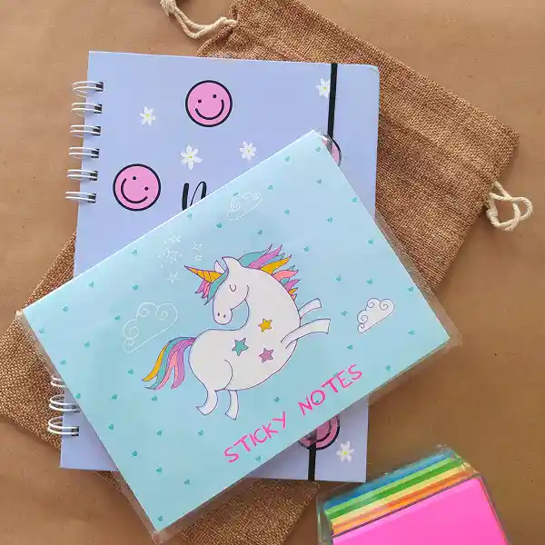CUADERNO DE 90 HOJAS, MEDIDAS 16X22.5CM, HOJAS EN PAPEL BOND DE 75GR, BLOCK DE NOTAS ADHESIVAS (INCLUYE 5 UNIDADES) EMPACADO EN BOLSA YUTE