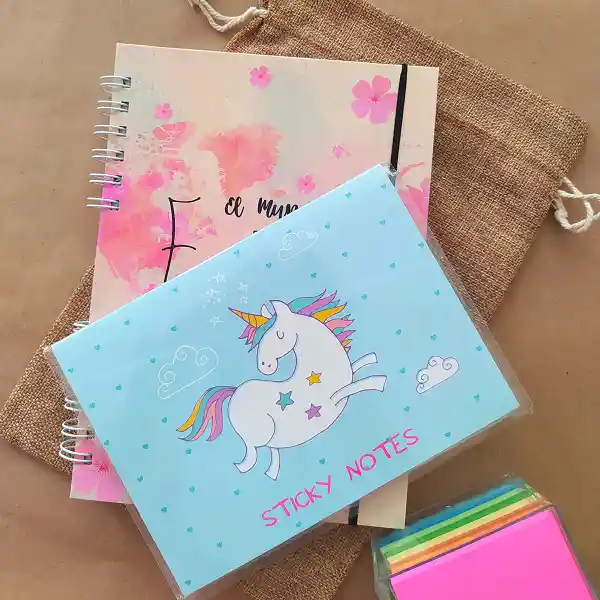 CUADERNO DE 90 HOJAS, MEDIDAS 16X22.5CM, HOJAS EN PAPEL BOND DE 75GR, BLOCK DE NOTAS ADHESIVAS (INCLUYE 5 UNIDADES) EMPACADO EN BOLSA YUTE