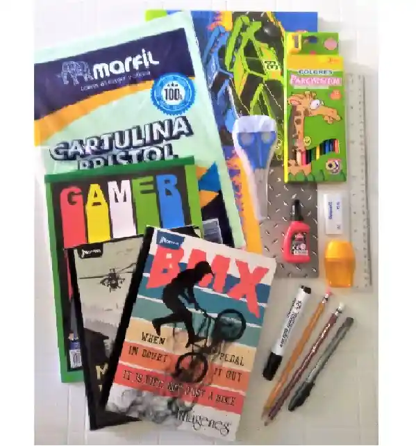 Kit Escolar Básico. Contiene: 1 Carpeta Carton 1 Regla 30cm 1 Colores Scribe x12 1 Paquete Cartulinas 1/8 1 Block carta 2 Cuadernos 100h rayado 1 Cuadernos 100h cuadriculado 1 cuaderno 50h rayado 1 Tijera punta roma 1 Borrador nata 1 Sacapuntas 1 Lapiz negro 1 Lapiz Rojo 1 Lapicero Negro 1 Lapicero rojo 1 Marcador borrable 1 resaltador neon 1 Marcador permanente
