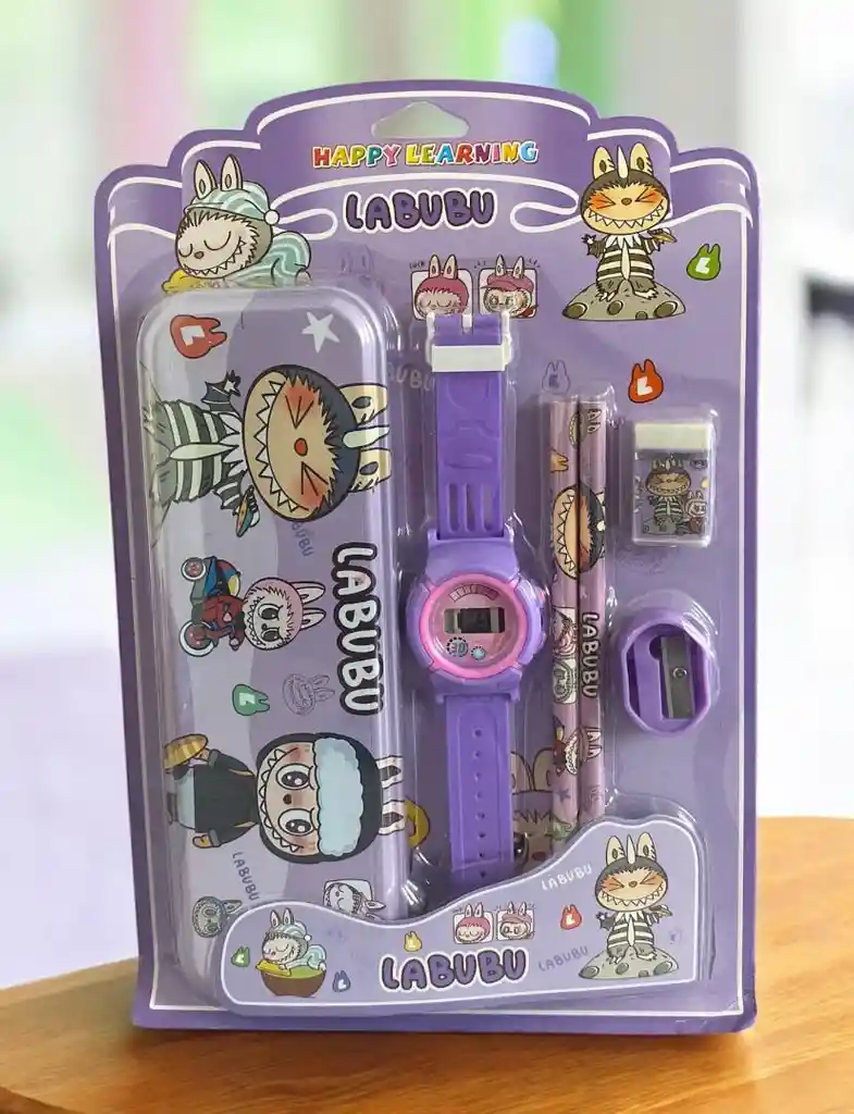 *KIT ESCOLAR LABUBU* Nuevo kit escolar para niños, diseño de LABUBU *INCLUYE* •Borrador •Sacapunta •Cartuchera metálica •2 Lápiz •Relog