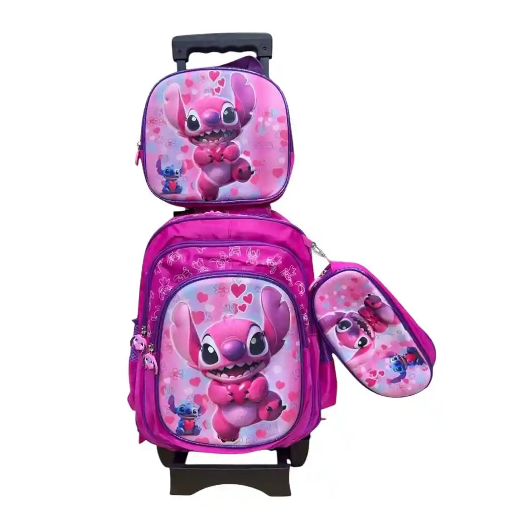 REGRESO A CLASES Trio de Ruedas 3D •Alto relieve 3D •Incluye Morral,lonchera y cartuchera •Morral de 3 cierres 3 compartimientos •Morral con Bolsillos laterales •Lonchera térmica •Cartuchera Doble cierre •Base de carro fija MEDIDAS Morral 45cm alto 31cm ancho Lonchera 26cm alto 26cm ancho Cartuchera 24cm alto 10cm ancho. Diseños exclusivos para Niñas