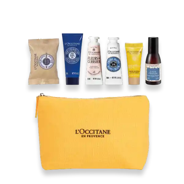 Kit Contiene 7 Unidades. Jabón Sólido Karité Leche 25 g + Crema Corporal Ultra Rica 20ml + Crema Para Manos Fleurs de Cerisier 10 mL + Crema Para Manos Karité 10 mL + Crema Hidratante Immortelle Divina 4 mL + Bruma Relajante Para Almohada Cocon Sérénité 15 mL + Bolsito Amarillo Loccitane 1 Und.