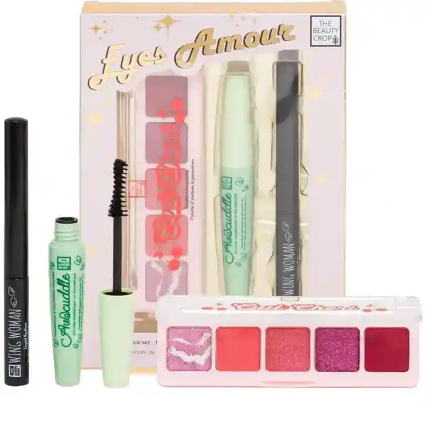 Este encantador set de ojos de 3 piezas incluye: Paleta de sombras de ojos Cherie Mini Treat. Máscara de pestañas. Delineador de ojos líquido Wing Woman. La sombra de ojos Cherie presenta tonos rosados y marrones. Tiene una gama de tres acabados diferentes: mate aterciopelado, mármol brillante y duocromo espectacular. Termina tu look de ojos con Wing Woman Eyeliner y da volumen a tus pestañas con Avocuddle Mascara.