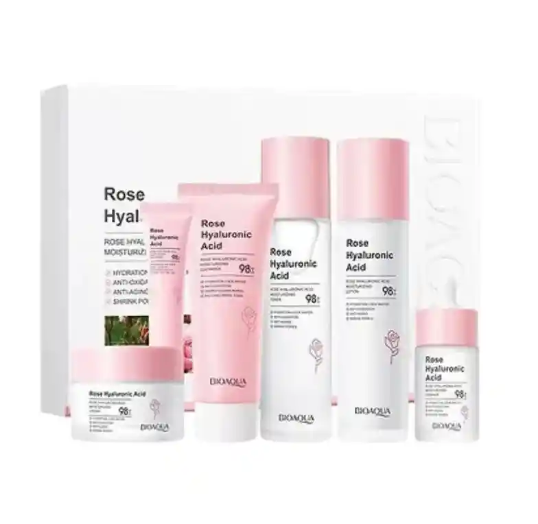 Kit Ácido Hialurónico y Rosas Bioaqua, increíble Box de 6 productos, rutina de Skin care completa. Tu piel se merece lo mejor, y nuestro Kit de 6 Productos de Ácido Hialurónico y Rosas Bioaqua es la respuesta. Este completo conjunto de cuidado de la piel transformará tu rutina diaria en una experiencia de belleza y bienestar. Los beneficios del ácido hialurónico y las propiedades rejuvenecedoras de las rosas se unen para brindarte una tez radiante y saludable. La caja de ácido Hialurónico y Rosas contiene: Jabón limpiador e hidratante 100 g Loción tonificante 100 ml Tónico hidratante 100 ml Serum rejuvenecedor 30 ml Crema contorno de ojos 20 g Crema hidratante y rejuvenecedora 50 g Los productos se aplican en el orden mencionado, preferiblemente realizar la rutina de skin care completa para ver los efectos deseados. La belleza y el bienestar de tu piel son nuestra prioridad. Nuestros productos de alta calidad te brindan una solución completa para el cuidado de la piel con ingredientes naturales que amarás. Descubre el poder del ácido hialurónico y las rosas en tu rutina de belleza diaria. ¡Tu piel te lo agradecerá!