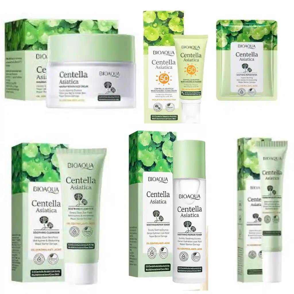 Kit Facial Centella Asiática Bioaqua 6 Productos Incluye: 1 Protector Solar Centella Asiática Bioaqua SPF50. 1 Jabón Facial Centella Asiática Bioaqua 100ml. 1 Contorno de Ojos Centella Asiática Bioaqua 20g. 1 Crema Facial Centella Asiática Bioaqua 50g. 1 Velo Facial Ácido salicilico Bioaqua 25g. 1 Tónico Facial Centella Asiática Bioaqua 100ml. Modo de Uso Diario: Paso 1: Luego de lavar el rostro, aplicar el tónico. Paso 2: Aplique el contorno de ojos. Paso 3: aplique la crema hidratante. Paso 4: Por ultimo aplique el bloqueador solar. Modo de Uso del Velo Facial: Aplicar con el rostro limpio dejar actuar de 15 a 20 minutos y luego retirar el velo. Recomendación: Entre la aplicación de un producto y otro se recomienda dejar actuar de 2 a 4 minutos para aplicar el siguiente. Puedes usarlo en el día y en la noche. Beneficios de la centella asiática: Proporciona una hidratación profunda y ayuda a reducir la apariencia de enrojecimiento, irritación y sequedad. La centella asiática es un poderoso antioxidante que protege la piel. Es control oil y control acné.