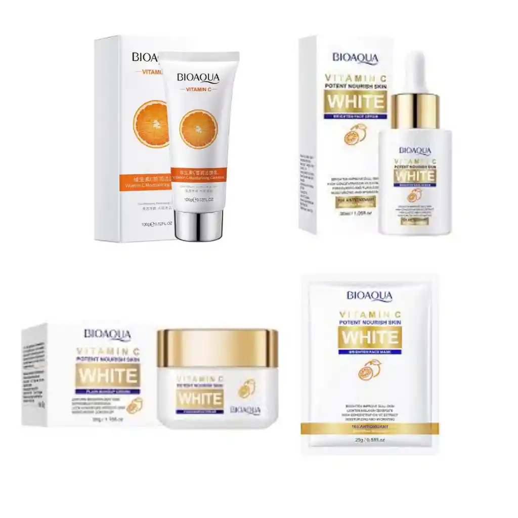 Somos LUNERASTORECOM una tienda ubicada en Bogotá donde encontrarás diversos productos para el cuidado diario de tu piel, maquillaje, así como accesorios para el cabello y complementos para tus rutinas de skin care. Envíos 100% seguros a nivel nacional. Kit Facial Vitamin C White Bioaqua 4 productos Incluye: 1 Serum Facial Vitamina C White Bioaqua 30ml. 1 Jabón Facial Vitamina C Bioaqua 100g. 1 Velo Facial Vitamina C White Bioaqua 25g. 1 Crema Facial Vitamina C White 50g. Modo de Uso Diario: Paso 1: Lavar el rostro. Paso 2: Aplique el serum Paso 3: Aplique la crema hidratante. Modo de Uso del Velo Facial: Aplicar con el rostro limpio dejar actuar de 15 a 20 minutos y luego retirar el velo. Recomendación: Entre la aplicación de un producto y otro se recomienda dejar actuar de 2 a 4 minutos para aplicar el siguiente. Recuerda que el kit es de uso nocturno. Si deseas usarlo de día debes aplicar bloqueador y no exponerte al sol. Beneficios: Previene y reduce la aparición de manchas ,unifica el tono de la piel. Nutre y aporta luminosidad a la piel.