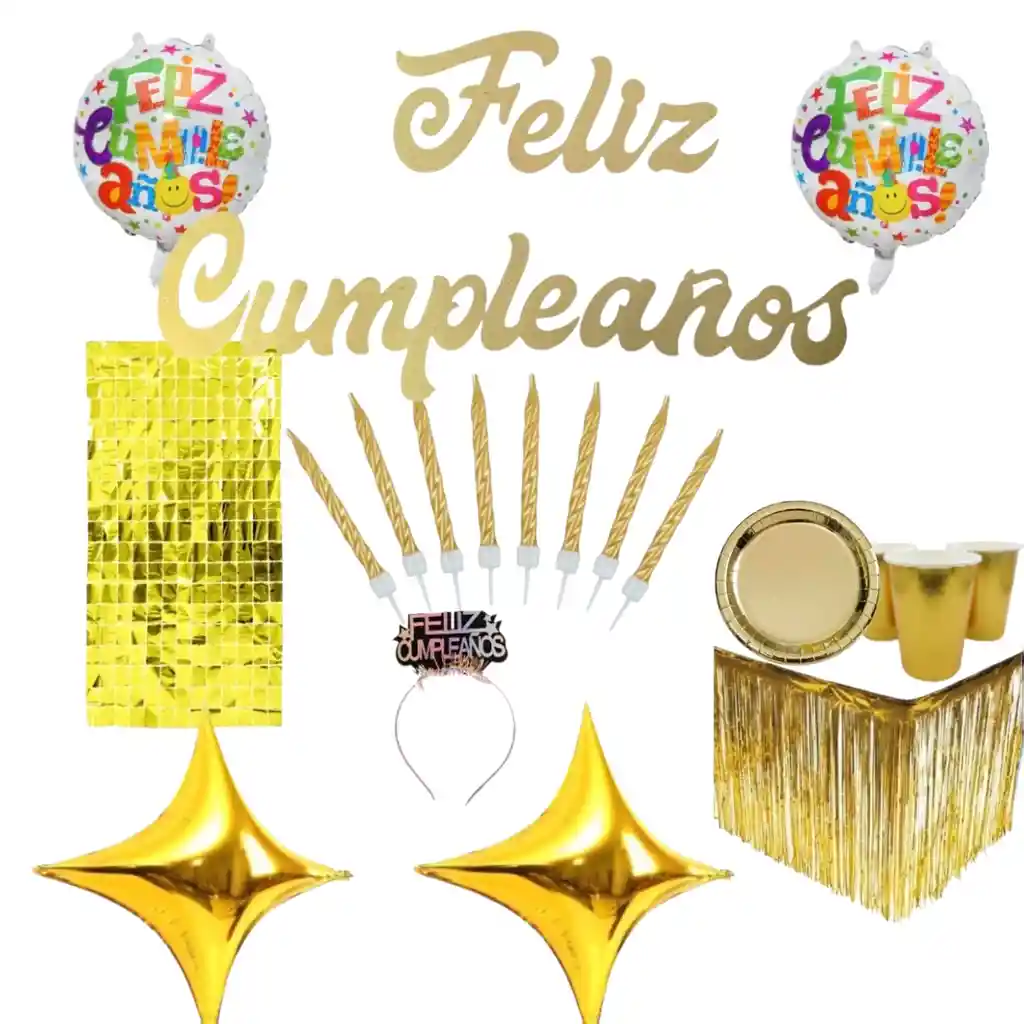 Contiene: 2 Globo Metalizado Feliz Cumpleaños 9", 1 Banderín Feliz Cumpleaños Dorado, 1 Cortina Cuadros Dorada 1 Metro De Ancha * 2 Metros De Larga, 1 Vela Dorada * 8 Pcs, 2 Estrella Metalizada Puntas Dorada 9", 1 Tara Feliz Cumpleaños, 1 Cortina Para Mesa Dorada 2 Metros De ancha * 1 Metro De Larga, Vaso Dorado * 10 Pcs, Plato Dorado* 10 Pcs